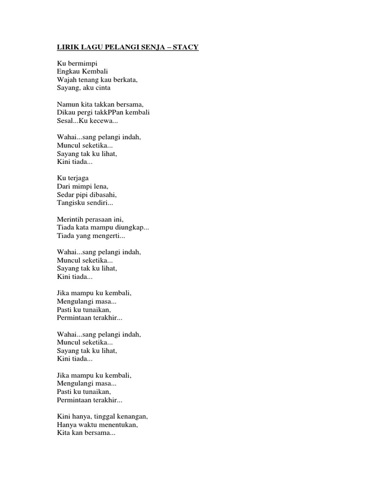 Lirik Lagu Pelangi Senja - Stacy. Biarpun aku Stacy bukannya permaisuri. Lirik Lagu Pelangi Senja - Stacy Ku bermimpi Engkau Kembali Wajah tenang kau berkata Sayang aku cinta Namun kita takkan bersama Dikau pergi takkan kembali.